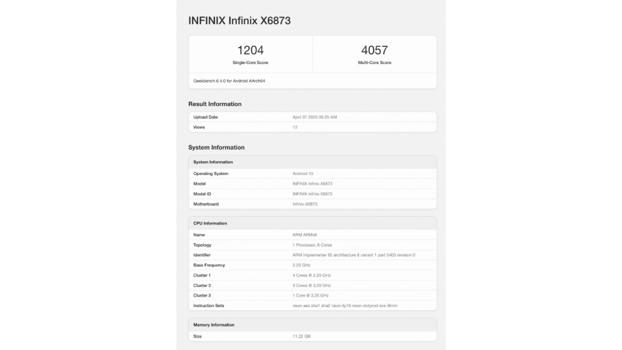 Infinix GT 30 Pro, X6873 model numarasıyla Geekbench data tabanında göründü. Akıllı telefon yapılan tek çekirdekli testlerden 1.204 ve çok çekirdekli testlerden ise 4 bin 57 puan almayı başardı. Böylelikle kimi özellikleri dolaylı yoldan da olsa doğrulandı.
