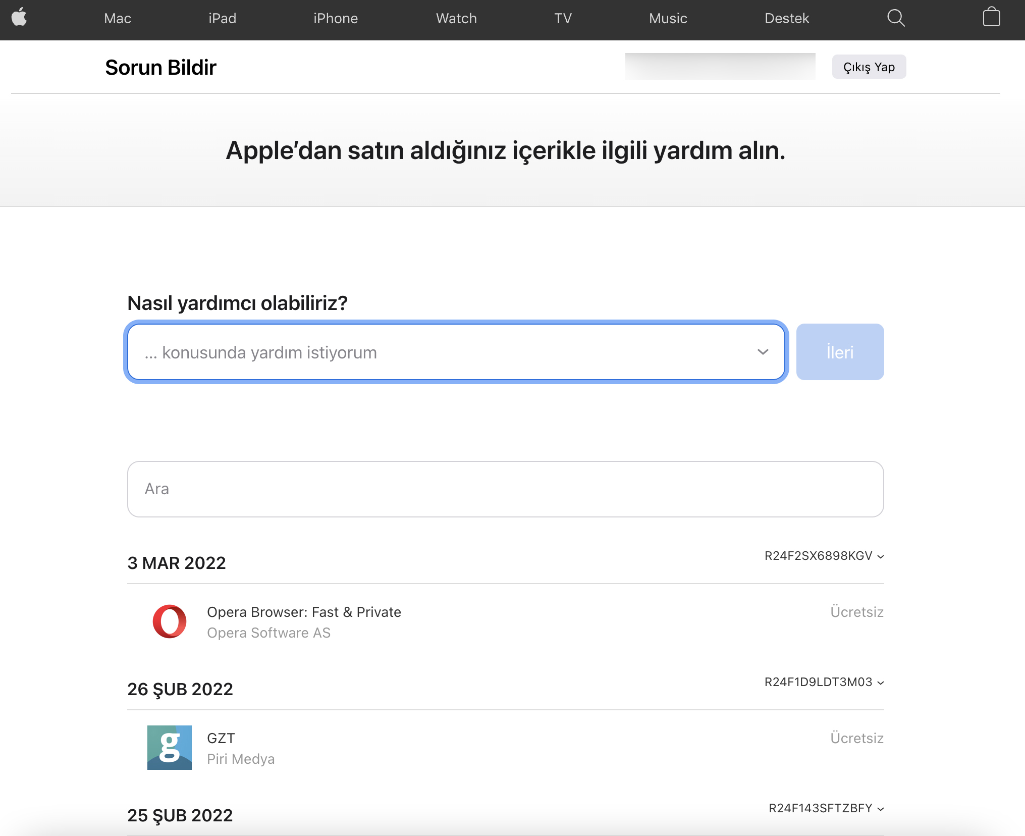 4 – ) Uygulamayı iade etme münasebetinizi bunlar ortasında tercih yaparak belirttikten sonra, alt kısımda fiyat iadesi talep ettiğiniz uygulamayı seçiyoruz. Şayet daha evvel satın aldığınız fiyatlı bir uygulama yoksa, bu alan boş görünecektir.