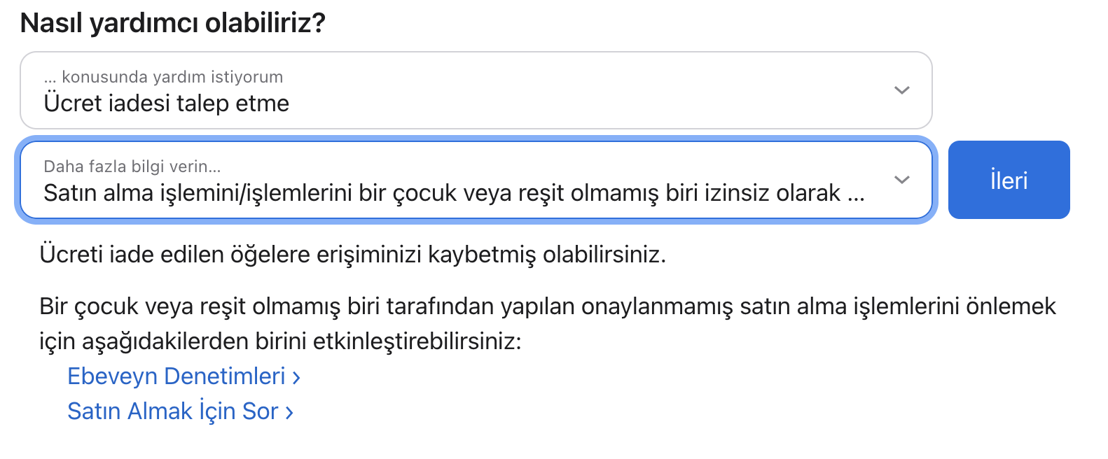 3 – ) Nasıl yardımcı olabiliriz? yazısının altındaki alana tıkladıktan sonra ve fiyat iadesi talep etme başlığını seçiyoruz, karşınıza çeşitli seçenekler çıkacak. Bu kısımda “Bunu satın almak istememiştim” yahut “Bu süreci bir çocuk / reşit olmayan birisi yaptı” üzere seçenekler çıkacak.