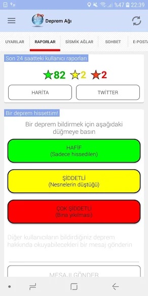 Anlık zelzele takip uygulamaları listesine LastQuake ile devam ediyoruz. Zelzelesi birinci hissedenlerin duygu ve niyetlerini belirtmelerine imkân veren uygulama, anket özelliği sayesinde interaktif olarak kullanıcıların birbirleriyle bağlantıya geçebileceği bir ortam oluşturuyor. Tıpkı vakitte her vatandaş bulunduğu bölgeden fotoğraf ve görüntü paylaşabiliyor.