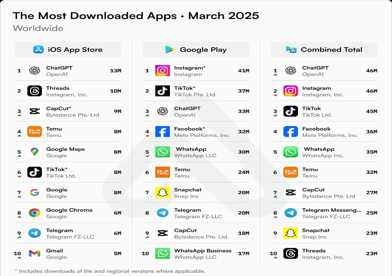 Instagram,aynı periyotta tekrar yaklaşık 46 milyon indirme almasına karşın, ChatGPT ile ortasındaki küçük fark nedeniyle ikinci sıraya geriledi. TikTok ise Şubat ayında elde ettiği liderliği Mart ayında koruyamadı ve yaklaşık 45 milyon indirme ile üçüncü sıraya düştü.