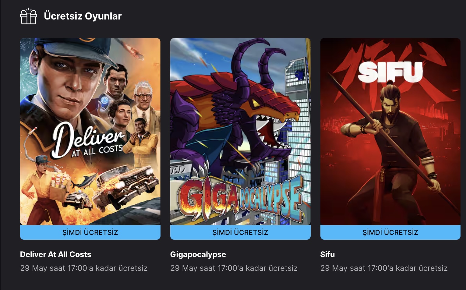 Geçtiğimiz hafta Dead Island 2 ve Happy Game üretimlerini fiyatsız veren Epic Games Store, bu hafta Deliver At All Costs, Gigapocalypse ve Sifu’yu fiyatsız bir formda erişime açtı. Üç oyun de 29 Mayıs’a kadar fiyatsız olacak. Bu tarihe kadar kütüphanenize eklerseniz kalıcı olarak sizin olacağını belirtelim.