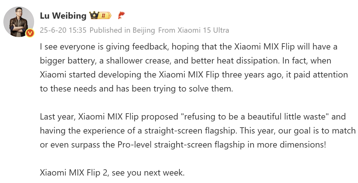Weibing, paylaşımında Mix Flip 2’nin önümüzdeki hafta tanıtılacağını doğruladı. Yönetici buna ek olarak Katlanabilir telefonun hem tasarım hem de donanımsal açıdan değerli güzelleştirmelerle geleceğini tabir ediyor.