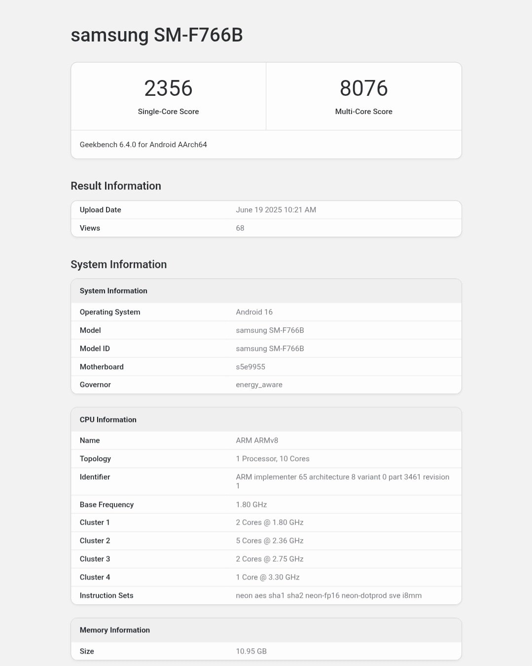 Galaxy Z Flip 7, SM-F766B model numarasıyla Geekbench data tabanında göründü. Akıllı telefon, tek çekirdekli testlerden 2 bin 356 ve çok çekirdekli testlerden ise 8 bin 76 puan aldı.