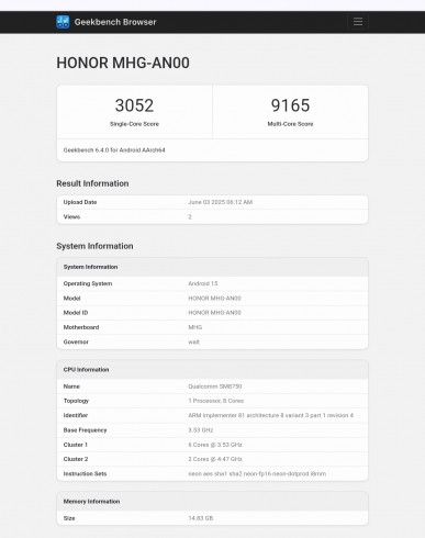 Aynı işlemci kısa müddet evvel tanıtılan Honor GT Pro gibi aygıtlarda da kullanılıyor. Honor Magic V5’in Geekbench’te test edildiği model numarası MHG-AN00 olarak listelendi. Bu modelin test sonuçlarına bir göz attığımızda, 16GB RAM ile birlikte Android 15 işletim sistemini çalıştırdığını görüyoruz.