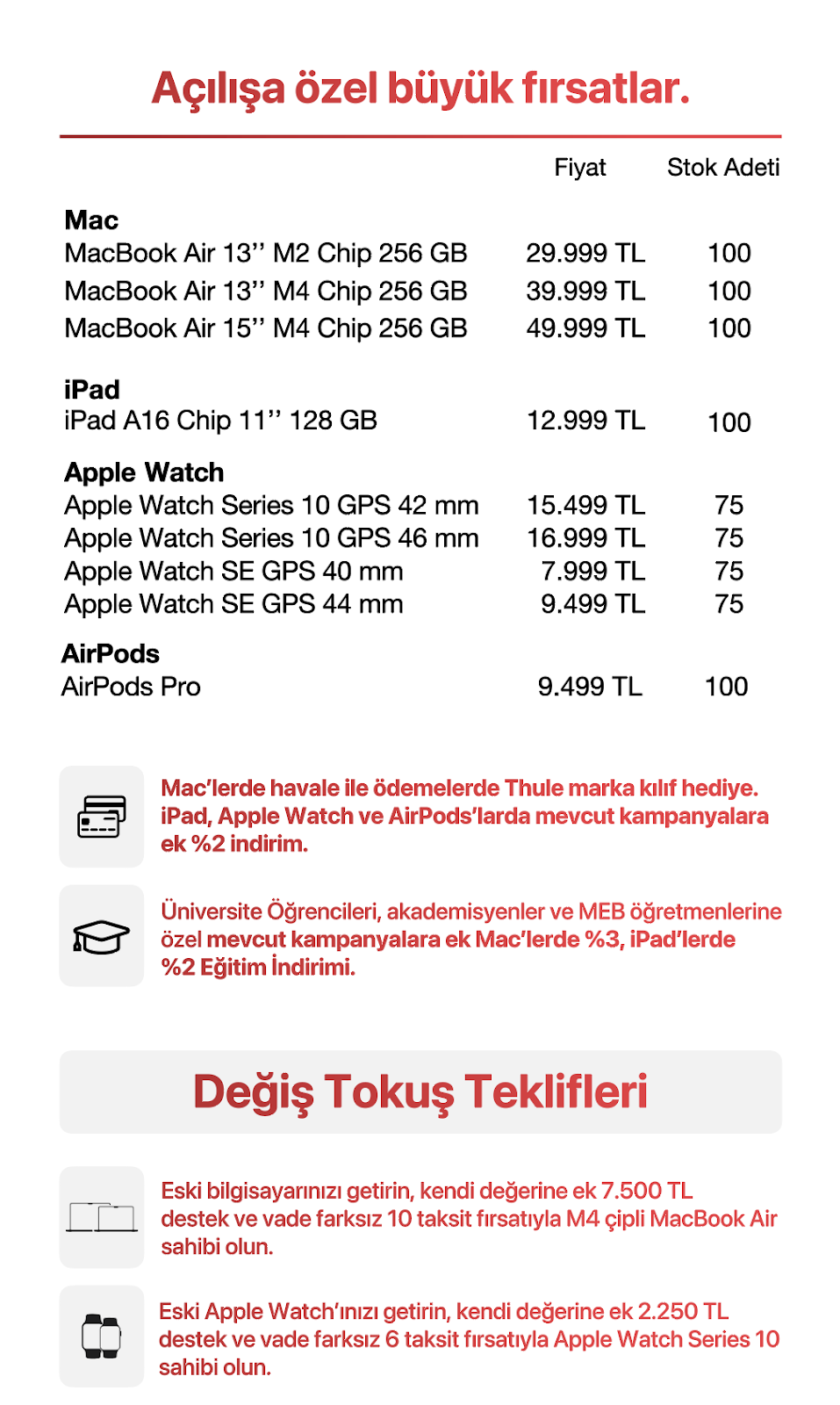 Yenilenen Gürgençler Cevahir mağazasında Apple dünyasına adım atmak ve bu avantajlı fiyatlardan yararlanmak isteyenler için 20-21 Haziran tarihlerinde kısıtlı stokla sunulan bu fırsatlar, Apple eserlerine avantajlı biçimde sahip olma imkanı sunuyor.