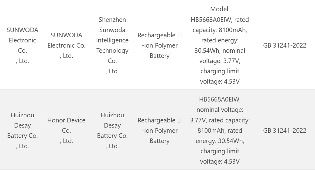 3C veritabanında, 8.100 mAh (nominal kapasite) bataryaya dair iki farklı liste yer alıyor. Her iki pil de HB5668A0EIW model numarasını taşıyor fakat biri Sunwoda Electronics, başkası ise Honor tarafından üretiliyor. Bu, 30.54Wh güce, 3.77V nominal voltaja ve 4.53V azamî şarj voltajına sahip bir Li-ion polimer batarya pozisyonunda.