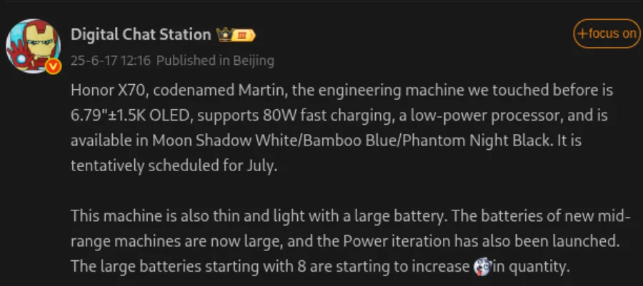 Cihazın işlemcisiyle ilgili olarak ise net bir bilgi verilmedi. Fakat sızıntılara nazaran düşük güç tüketimli bir yonga seti kullanılacak. Karşılaştırma yapmak gerekirse, bir evvelki model olan Honor X60 6nm üretim süreciyle üretilmiş MediaTek Dimensity 7025 Ultra çipinden güç alıyor.