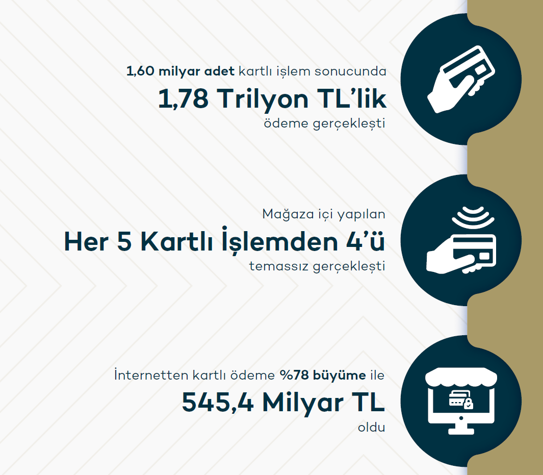 Özellikle internetten yapılan kartlı ödemelerde görülen yüzde 78’lik artış ve temassız ödemelerin mağaza içi ödemelerin yüzde 81’ini oluşturması, Türkiye’nin dijital ödeme sistemlerinde süratle ilerleyen bir ülke olduğunu gösteriyor.