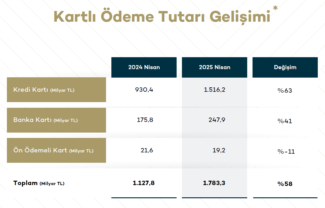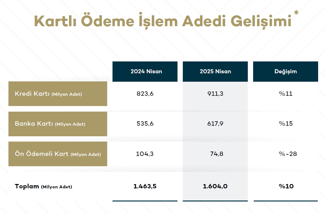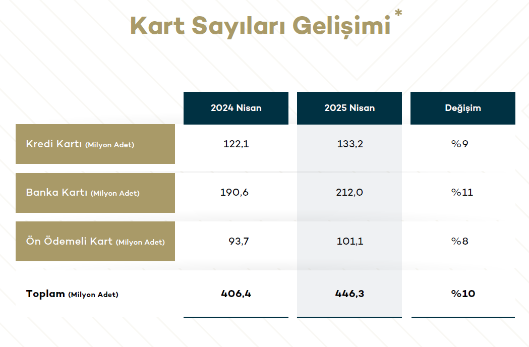 BKM bilgilerine nazaran Nisan 2025 prestijiyle Türkiye’deki toplam kart sayısı 446,3 milyon adede ulaşarak, geçen yılın tıpkı devrine nazaran yüzde 10’luk bir artış gösterdi. Bu kartların 133,2 milyonu kredi kartı, 212,0 milyonu banka kartı ve 101,1 milyonu ise ön ödemeli kart olarak raporlandı.