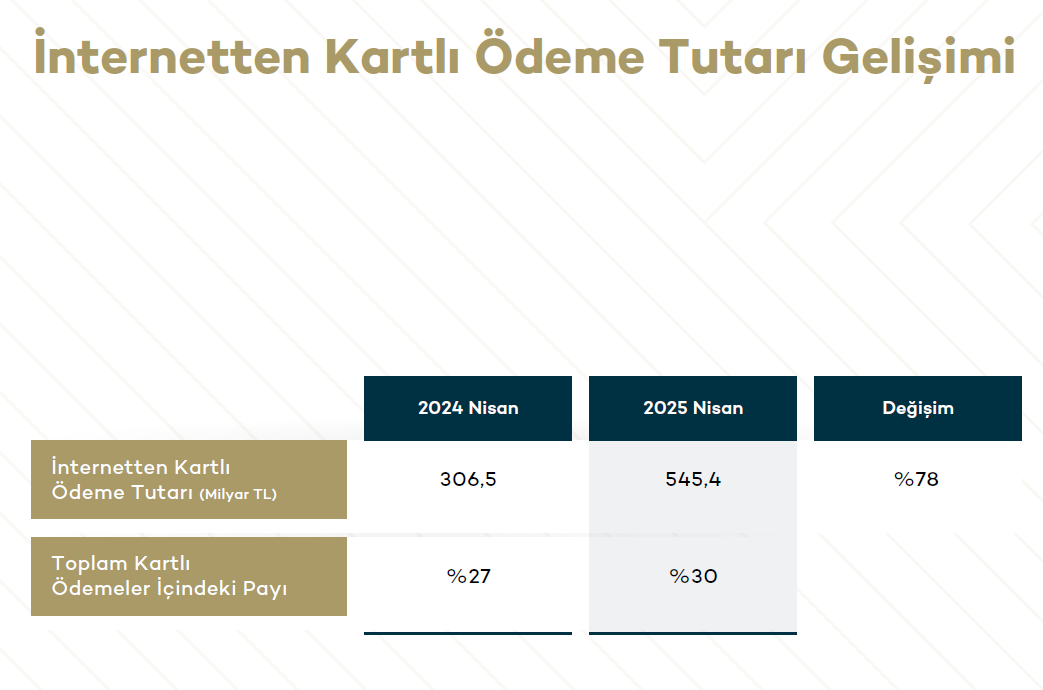 İnternetten yapılan kartlı ödemeler, Nisan 2025’te geçen yılın tıpkı devrine nazaran yüzde 78 üzere etkileyici bir oranda artarak 545,4 milyar TL’ye ulaştı. İnternetten yapılan kartlı ödemelerin toplam kartlı ödemeler içindeki hissesi da yüzde 30’a yükseldi.