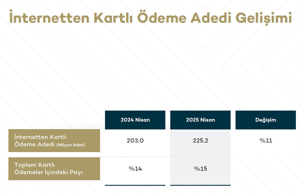 Bu oran, geçen yılın birebir devrinde yüzde 27 düzeyindeydi. Süreç adedi açısından bakıldığında, internetten yapılan kartlı ödeme adedi yüzde 11 artarak 225,2 milyon adede ulaştı. İnternetten yapılan kartlı ödemelerin toplam süreçler içindeki hissesi ise yüzde 15 olarak gerçekleşti. Bu datalar, Türkiye’de e-ticaretin ve dijital ödemelerin süratle büyümeye devam ettiğini gösteriyor.