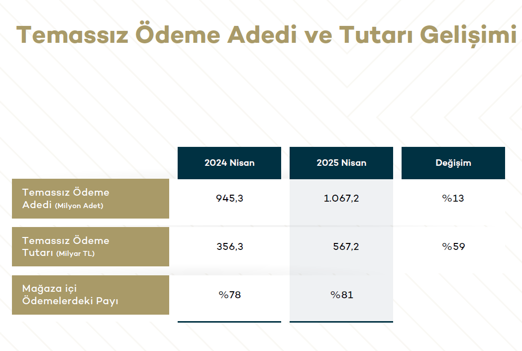 Temassız ödeme adedi, geçen yılın birebir devrine nazaran yüzde 13 artarak 1,07 milyar adede ulaşırken, temassız ödeme meblağı ise yüzde 59 artarak 567,2 milyar TL olarak gerçekleşti. Bu bilgiler, temassız ödeme teknolojisinin tüketiciler tarafından benimsendiğini ve standart bir ödeme yolu haline geldiğini gösteriyor.
