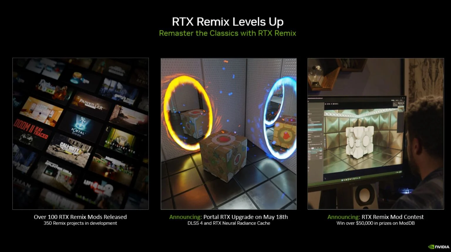 NVIDIA ayrıyeten RTX 5060 duyurusuyla birlikte yazılım muvaffakiyetlerini da ön plana çıkardı. DLSS 4’ü destekleyen daha fazla oyunun yanı sıra eski PC oyunlarının manzara kalitesini gelişmiş teknikler kullanarak güzelleştiren RTX Remix teknolojisindeki güncellemelerden de bahsetti.