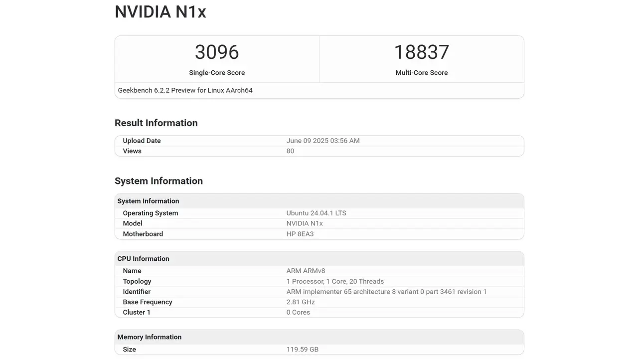 N1X işlemcisi, Geekbench veritabanında 20 çekirdekli bir yapı ve 20 iş parçacığıyla listelendi. Temel frekans 2.81 GHz olarak ölçülürken, yonganın 4.05 GHz’e kadar çıkabildiği görülüyor. Skorlar ise tek çekirdekte 3.096, çok çekirdekte 18.837 puan olarak kaydedildi.