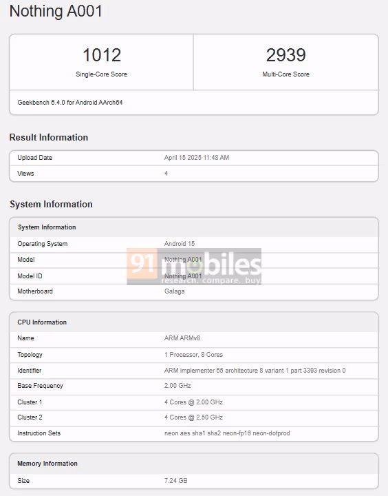 CMF Phone 2 Pro, A001 model numarasıyla Geekbench bilgi tabanında göründü. Akıllı telefon yapılan tek çekirdekli testlerden 1.012 ve çok çekirdekli testlerden ise 2 bin 939 puan almayı başardı. Bu sayede birtakım özellikleri dolaylı yoldan da olsa muhakkak oldu.