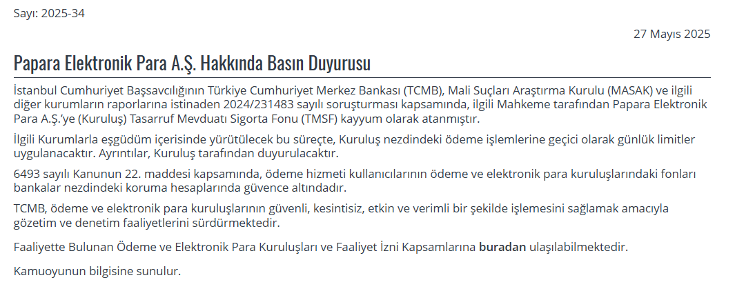 Papara’nın yaptığı açıklamada, yaşanan aksaklıklar için kullanıcılardan özür dilendi. Şirket, sorunun kaynağı olarak Türkiye Cumhuriyet Merkez Bankası’nın aldığı bir düzenlemeyi işaret etti. Buna nazaran ödeme süreçlerine süreksiz bir mühletle günlük limit uygulaması getirildi. Açıklamada, bu sınırlamanın Merkez Bankası’nın resmi açıklamasında da yer aldığı belirtildi.