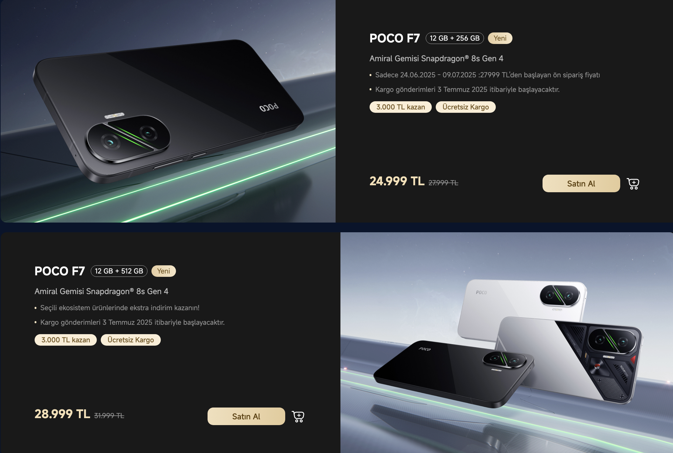 POCO F7‘nin 12 GB RAM ve 256 GB depolama sunan başlangıç varyantı 24 bin 999 TL‘den satışta diyebiliriz. Öte yandan, 12 GB RAM ve 512 GB depolamalı versiyonu ise 28 bin 999 TL‘den raflardaki yerini alacak.