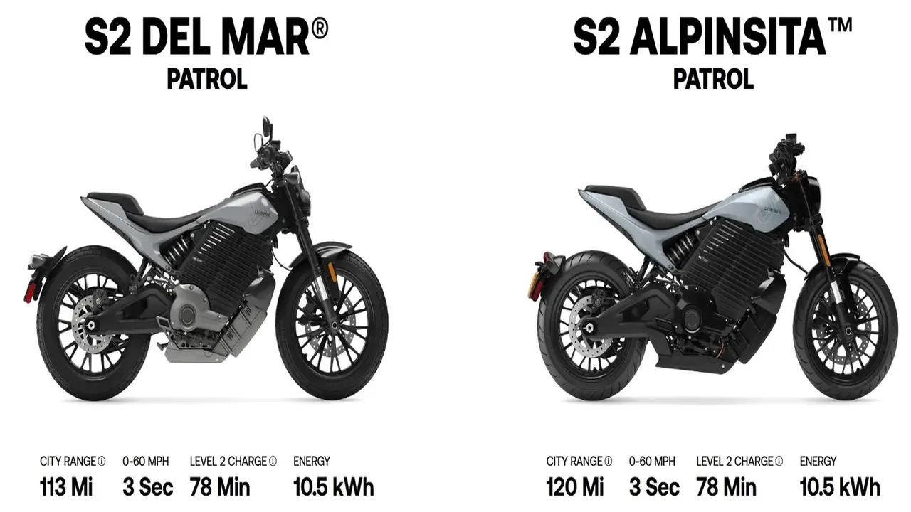 Tanıtılan modeller S2 Del Mar ve Alpinista ismini taşıyor. Her iki model de yaklaşık 15.999 ila 16.249 dolar ortasında değişen fiyatlarla satışa çıkacak. Kent içi kullanımda 190 kilometreye kadar menzil sunan motosikletlerde, beş yıl batarya ve iki yıl sınırsız kilometre garantisi bulunuyor.