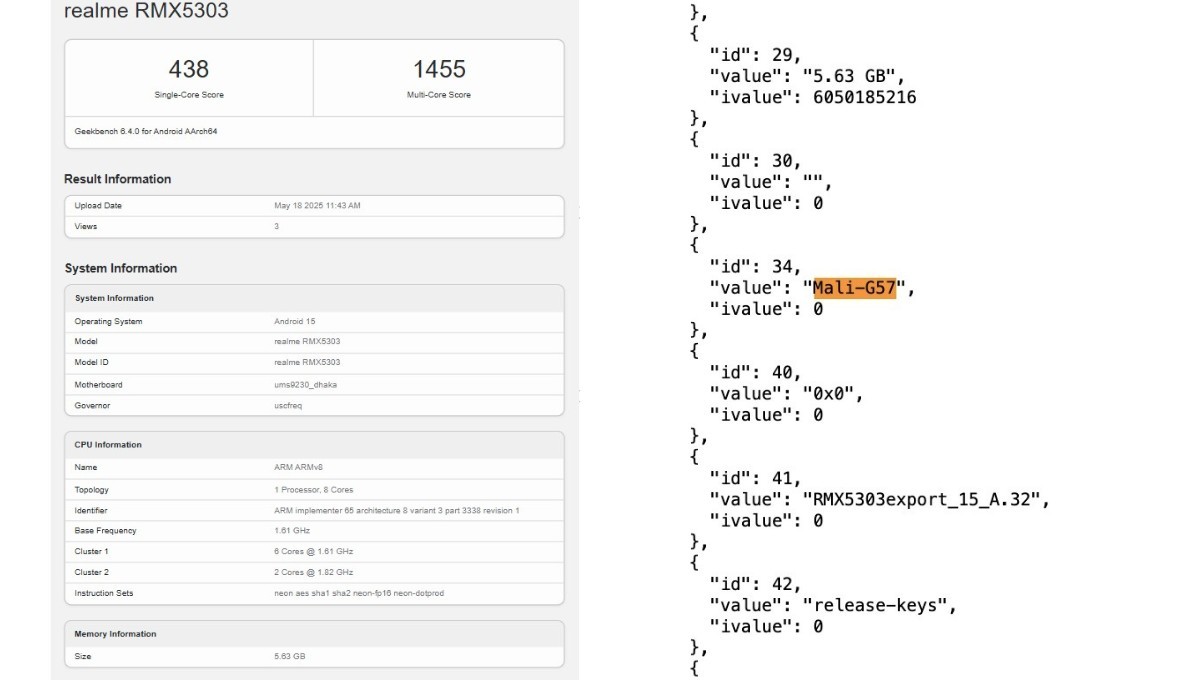 realme C71, RMX5303 model numarasıyla Geekbench’te göründü. Akıllı telefon yapılan tek çekirdekli testlerden 438 ve çok çekirdekli testlerden ise 1.455 puan almayı başardı. Bununla birlikte, modelin birtakım özellikleri dolaylı yoldan da olsa doğrulandı.