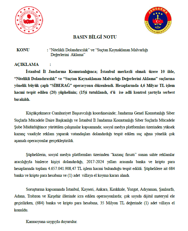 SİBERAĞ ismi verilen operasyon sonucunda toplam 4,6 milyar TL’lik süreç hacmine ulaşan bir kabahat ağı deşifre edildi. Soruşturma kapsamında gözaltına alınan 20 şüpheliden 15’i tutuklandı, 4’ü ise isimli denetim kaidesiyle hür bırakıldı.
