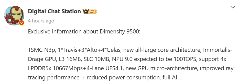 İşlemcide bir Travis çekirdeği, üç Alto çekirdeği ve dört Gelas çekirdeği bulunacak. Travis ve Alto çekirdeklerinin ARM’ın en yeni Cortex-X9 serisine dayandığı ve SME komutlarını desteklediği söylenirken, Gelas ise A7 serisinin yeni jenerasyon büyük çekirdekleri olarak lans ediliyor. Bu, Cortex-X4 çekirdeklerine dayalı Dimensity 9400 çipine kıyasla kıymetli bir değişimi işaret ediyor diyebiliriz.
