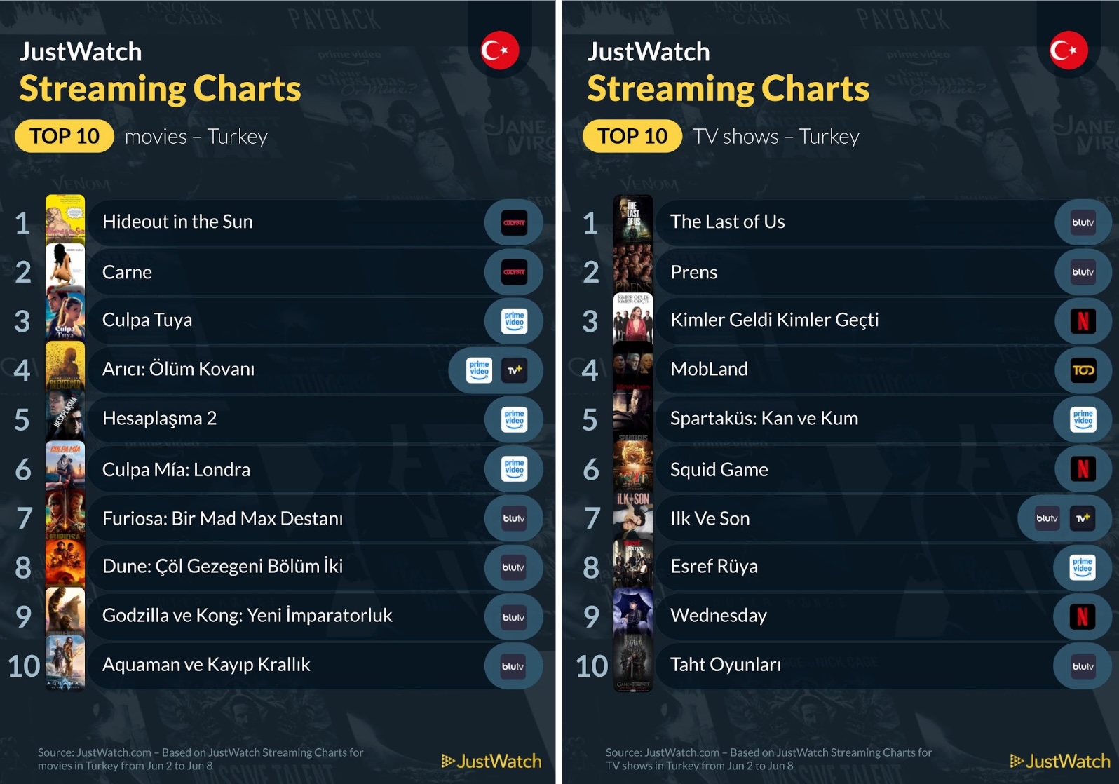 JustWatch tarafından paylaşılan şimdiki datalara nazaran Türkiye’de dijital platformlarda en çok izlenen dizi ve sinemalar belirli oldu. 2 Mayıs – 8 Haziran tarihleri ortasındaki dataları kapsayan listede Netflix, Amazon Prime Görüntü, Disney+, BluTV üzere tanınan platformlardaki izlenme oranları yer alıyor. İşte haftanın en tanınan sinema ve dizileri…