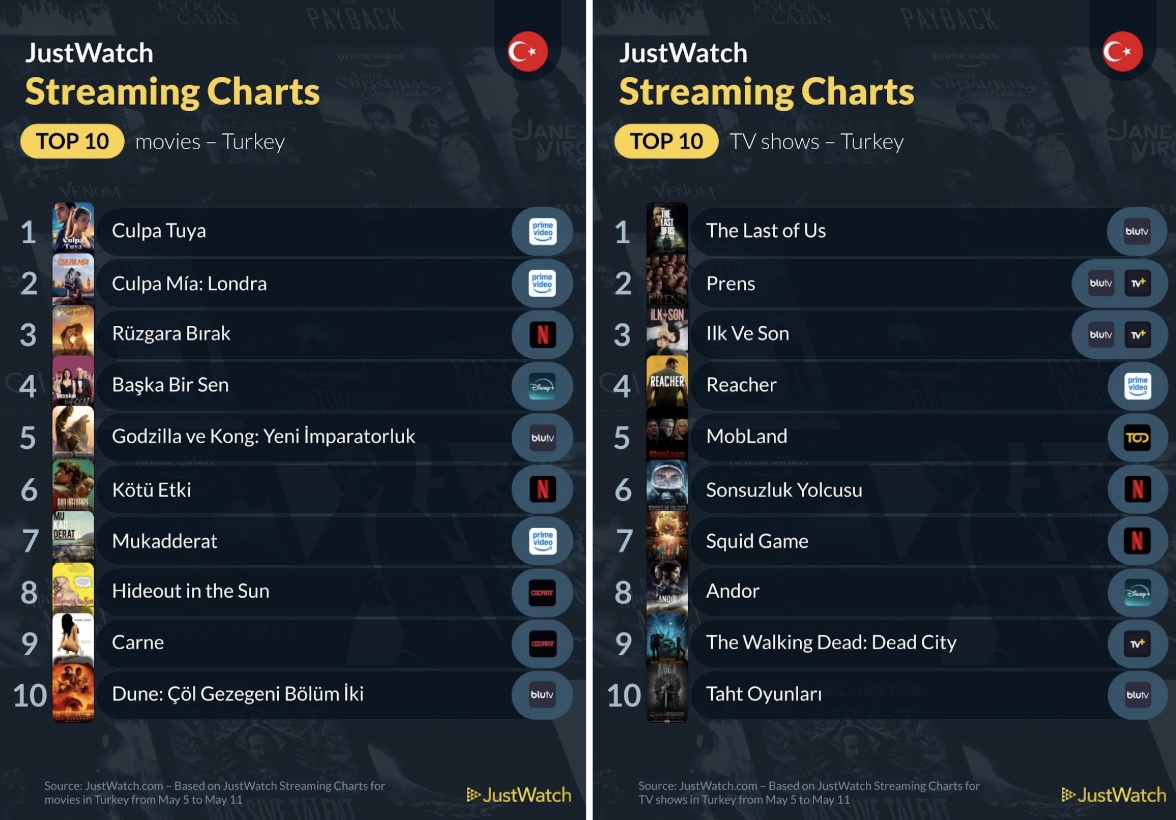 JustWatch tarafından paylaşılan şimdiki datalara nazaran Türkiye’de dijital platformlarda en çok izlenen dizi ve sinemalar aşikâr oldu. 5 – 11 Mayıs tarihleri ortasındaki bilgileri kapsayan listede Netflix, Amazon Prime Görüntü, Disney+, BluTV üzere tanınan platformlardaki izlenme oranları yer alıyor. İşte haftanın en tanınan sinema ve dizileri…