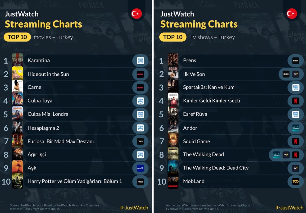 JustWatch bilgilerine nazaran, 9 – 15 Haziran tarihleri ortasında Türkiye’de dijital platformlarda en çok izlenen dizi ve filmler aşikâr oldu. Listede Netflix, Amazon Prime Görüntü, Disney+ ve BluTV üzere platformlardaki izlenme oranları yer alıyor.
