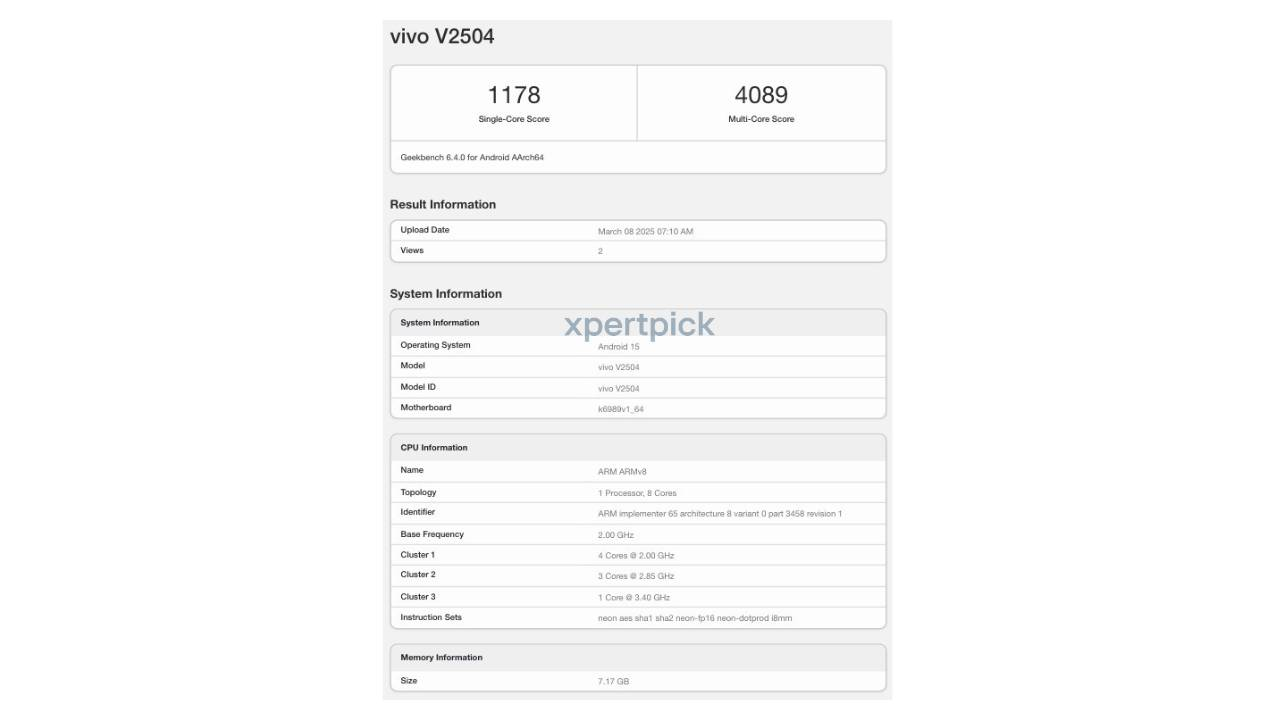vivo T4 Ultra, V2504 model numarasıyla Geekbench bilgi tabanında göründü. Akıllı telefon yapılan tek çekirdekli testlerden 1.178 ve çok çekirdekli testlerden ise 4 bin 89 puan aldı. Böylece kimi özellikleri dolaylı yoldan da olsa doğrulandı.