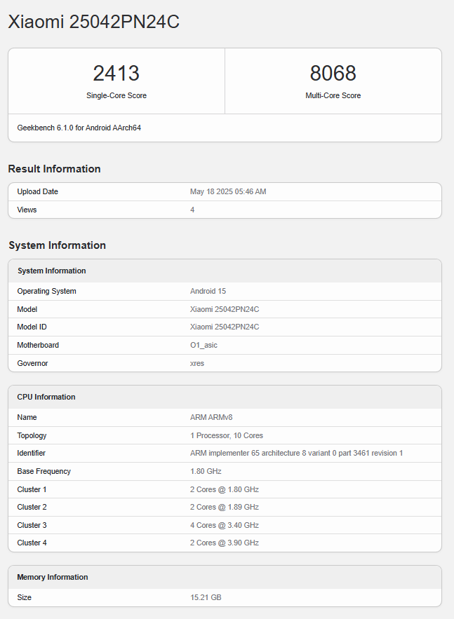 Xiaomi 15s Pro, 25042PN24C model numarasıyla Geekbench bilgi tabanında göründü. Akıllı telefon yapılan tek çekirdekli testlerden 2 bin 413 ve çok çekirdekli testlerden ise 8 bin 68 puan almayı başardı. Böylelikle aygıtın birtakım özellikleri dolaylı yoldan da olsa muhakkak oldu.